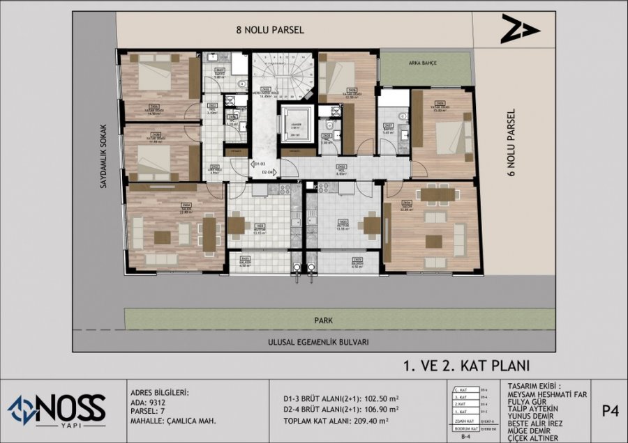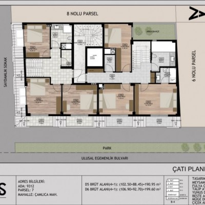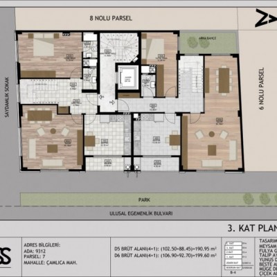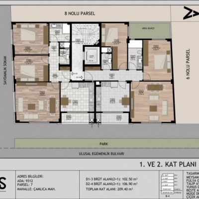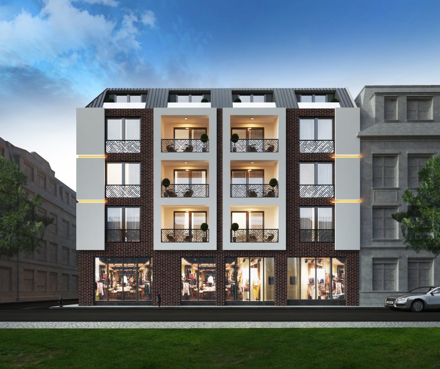 Binamız zeminde işyerleri ve 1. kattan başlayarak daire şeklinde ilerlemektedir. 1. ve 2. katımız 2+1 dairelerden 3. katımız ise 4+1 dairelerden oluşmaktadır. 4+1 daireleremiz dubleks şeklindedir. 191m2 ve 200 m2 olarak 2 seçeneğimiz vardır. 2+1 dairelerimizde ise 103 m2 ve 107 m2 seçeneğimiz vardır.